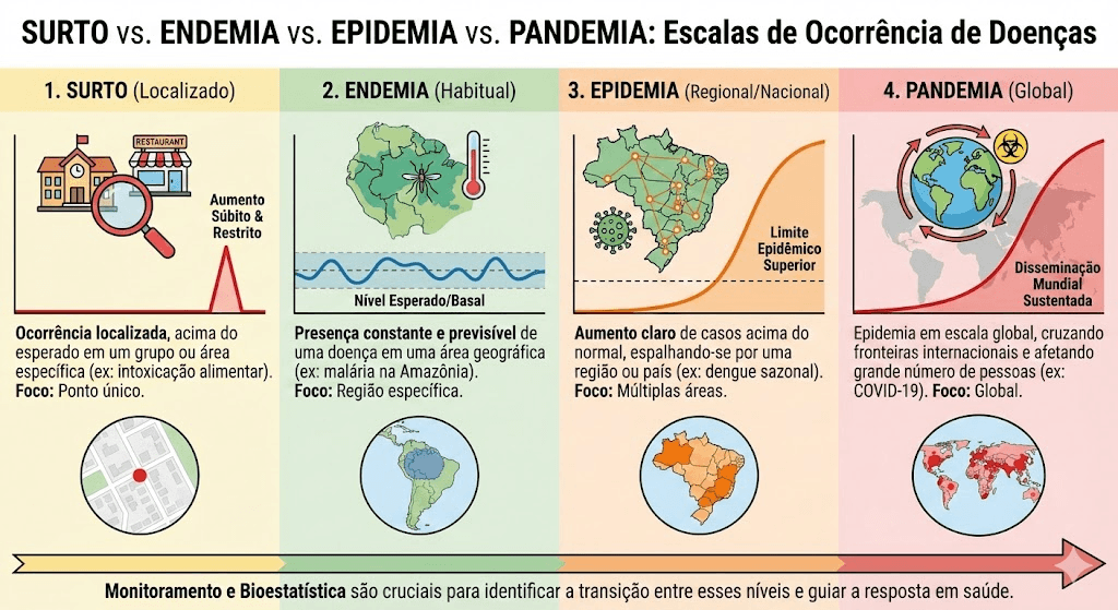 Compreender a escala dos eventos de saúde é o primeiro passo para uma gestão pública eficiente. Como vimos, a diferença entre epidemia e pandemia reside na escala geográfica e na necessidade de cooperação internacional, enquanto o surto e a endemia nos ajudam a monitorar o cotidiano da saúde local.